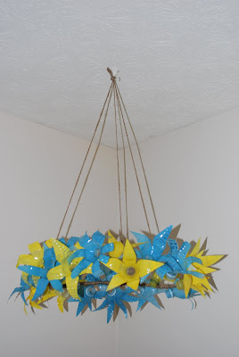 I'm trying this out, with some small changes. Couldn't find any spray paint here, so I'm painting them with acrylics. Held a few of the flowers against a light and they have this cool translucent, eclectic effect. And instead of layers, I going to attempt a sort of spiral and glue the flowers on that, and suspend two or three bulbs. Oh, and I've cut the petals shorter, using only the 500 ml bottles (I have a project in mind for the remaining bottle!). Gosh, I hope it works out!